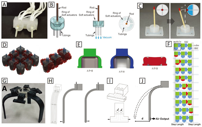 (A-B)四足软体机器人及其采用的cVAM驱动器的结构设计;(C)在-90 kPa下的cVAM执行器的工作状态;(D)可全方向运动的软体模块化机器人;(E)软体圆柱状驱动器在不同压力情况下的变形;(F)机器人爬行机理(蓝色代表正压力作用,红色代表负压作用);(G)依靠气压推动的执行器所构成的三足软体机器人;(H-J)气体驱动的肢体变形与运动状态。