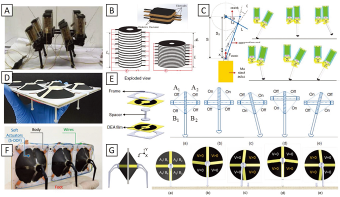 (A)一种依靠多层叠DEA驱动的仿生四足机器人;(B)多层叠DEA的电致驱动机理;(C)四足机器人的运动步态(摆动相与支撑相)以及曲柄滑块运动原理;(D)第一代Sungkyunkwan六足机器人S-Hex I;(E)足部驱动器的设计以及相应运动步态;(F)第二代Sungkyunkwan六足机器人S-Hex II;(G)改进的足部驱动器设计以及相应运动步态。