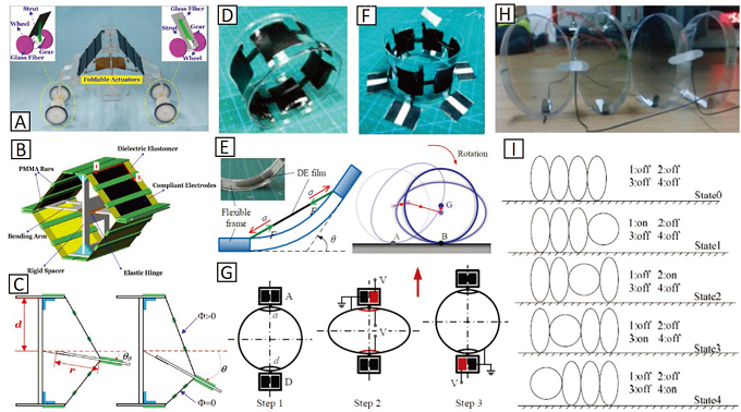 (A)可折叠DEA驱动软体爬行机器人;(B)增强型可折叠DEA的CAD模型以及其(C)驱动机理;(D)基于多节DEMES驱动的软体滚动机器人(RSR);(E)单节DEMES结构驱动时的应力状态以及RSR的滚动原理;(F)由DEA构成身体以及六组EAA作为足的全方向可移动软体机器人(OSCR)及其(G)运动机理;(H)由闭环式DEA结构单元组装而成的爬行机器人及其(I)滑行运动机理。