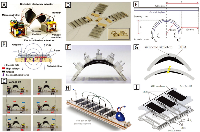 (A)基于DEA以及EAA的无牵引软体机器人;(B)EAA的驱动原理;(C)无牵引软体机器人的运动机理;(D)四足尺蠖型机器人及其(E)爬行机理;(F)实现完全软体的爬行机器人及其(G)运动原理;(H)“Trevor”软体机器人及其(I)应用的集成式DEO组件。