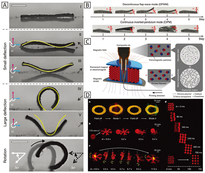 (A-B)多足磁控软体机器人;(C)打印制备快速变形的软体机器人; (D)3D打印的磁控变弹性体在多种编程式磁场中的功能性演示,包括(a)基于不同磁场方向所展现出不同电子功能的可重组的电子设备;(b)可阻拦并抓取快速移动物体的六面体结构;c)定点运送药片;d)施加磁场突转所引起的3D膨胀结构的水平跳跃。