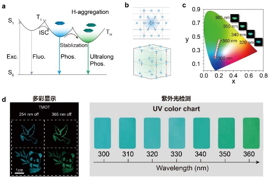 由于其具有长寿命、大的斯托克斯位移以及丰富的激发态性质,长余辉材料被广泛的应用于防伪、加密以及生物成像等前沿科学领域。随着柔性电子的发展,短短几年时间,具有长余辉发光性质的有机“夜明珠”受到了广泛关注。科学家通过调控分子结构、晶体分子堆积等策略,基于不同发光材料结构,实现了长余辉发光颜色调控。该策略不仅操作复杂,而且不可控,具有一定偶尔性。尽管多彩发光应用广泛,如何在单一材料结构中实现多彩长余辉发光是该领域面临的重大研究挑战之一。针对这一科学难题,黄维院士、安众福教授所带领的团队与新加坡国立大学刘小钢教授课题组合作,借鉴量子点等纳米材料实现多彩发光设计思想,在单一有机分子晶体中,通过巧妙的分子结构和晶体堆积设计,同时构筑单分子态和聚集态的长余辉发光,获得了一系列激发波长依赖的动态多彩长余辉发光新材料。在晶体状态下,随着激发波长从250到400 nm的逐渐红移,有机长余辉发光颜色逐渐由紫色变为绿色,呈现出激发波长依赖的长余辉发光特性。该类材料的长余辉寿命为2.45秒,最大长余辉发光效率为31.2%。鉴于这种动态长余辉发光特性,该类材料被首次成功应用于多彩显示和可视化紫外光精准检测。该创新性研究成果不仅颠覆了我们对长余辉发光性质调控的认知,同时还为开发更加智能化新材料实现在有机光电子、柔性电子等领域应用提供了新思路。
