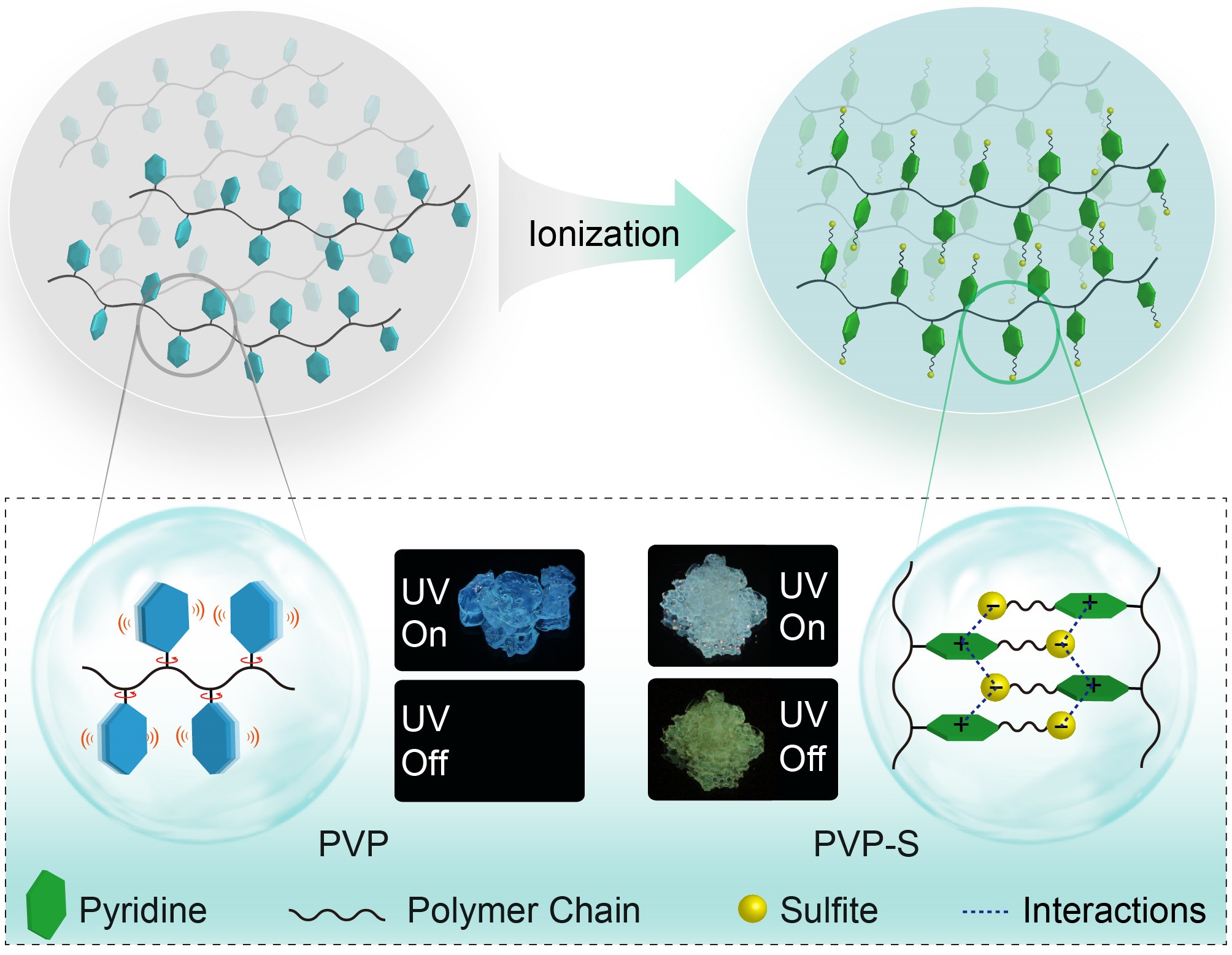 该团队提出通过在聚合物体系中引入离子键的方法,有效地限制了发色团的运动进而抑制其非辐射跃迁过程,实现了离子型聚合物的长寿命以及颜色可调的磷光发射。为了进一步拓展室温有机磷光体系的范围,他们又以聚乙烯基吡啶聚合物为例,设计并合成了一系列纯有机的离子化聚乙烯基吡啶衍生物,该离子化聚合物不仅可以实现超长磷光的发射,并且其磷光颜色可通过不同激发波长的刺激在低温下实现从蓝到红全可见光谱的可逆变化,该研究为开展具有刺激响应性质的功能性磷光材料提供了新思路,并为基于柔性、大尺寸、低成本的有机聚合物磷光材料的发展提供了更加广阔的平台。