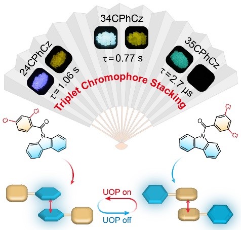 一般来说,每个有机发光分子由不同属性的结构单元组成,其中一些有利于三线态激子的产生可被视为三线态发色团,比如咔唑,吩噻嗪等,而其他基团主要起着调控分子排布的作用,可以看作是功能基团。那么,到底哪部分基团之间的有效堆积才是产生超长有机磷光的关键呢?南京工业大学黄维院士与安众福教授带领研究团队通过研究一系列芳香酰胺衍生物的发光性能,提出了超长有机磷光产生的新认知。他们通过改变氯原子在功能基团-苯环上的位点,调控三线态发色团-咔唑结构的堆积模式,实现了超长有机磷光的开/关转换。结合实验数据与理论计,他们发现三线态发色团之间的有效堆积在UOP形成过程中起着关键作用。仅有三线态发色团单元之间形成有效结构堆积才能实现超长有机磷光。该项研究不仅深入解释了纯有机化合物超长磷光发射的内在机理,而且为获得高效UOP材料提供了新的指导。