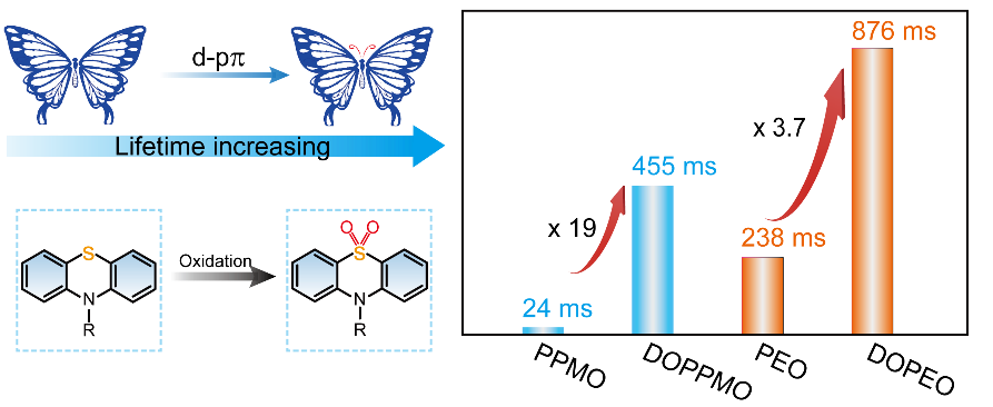 南京工业大学安众福教授与黄维院士团队与辽宁大学梁福顺教授、长春理工大学苏忠民教授合作,受过渡金属配合物中广泛存在的d-pπ键的启发,提出利用d-pπ键调控纯有机分子的激发态电子组态,从而实现磷光寿命延长的新策略。基于此方法,他们获得了一系列新型的有机长余辉发光材料。相关工作以VIP形式发表在Angewandte Chemie International Edition上。利用化学修饰和晶体工程,在非平面的蝴蝶型结构的吩噻嗪模型体系中,通过把硫原子氧化成砜,简单易行的构筑了d-pπ键,实现了超长室温磷光发射。含时密度泛函理论理算和晶体结构解析表明:d-pπ键的引入,不但降低了最低三重激发态中(n, π*)成份,而且使分子堆积更加紧密,创造了更加刚性的分子环境。二者的协同作用,对实现了材料的超长有机磷光起到了重要作用。此工作从化学键的角度出发,为构筑新型超长磷光材料和延迟室温磷光寿命提供了新思路。