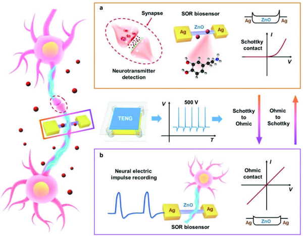 该研究提出了一种简单有效且不易损坏纳米器件的肖特基势垒动态调控方法,该研究实现了单个器件在肖特基接触状态与欧姆状态之间的可逆转变。TENG电压脉冲可有效降低器件的SBH,停止TENG处理后SBH会随着时间逐渐恢复。这一可逆转变的机制可归因于TENG产生的高电压脉冲使ZnO内部的氧空位发生扩散。在本论文中,同一个SOR生物传感器在肖特基接触状态实现了对低浓度多巴胺(0.5 µmol mL-1)的高灵敏度检测,经TENG处理转变为欧姆接触后,SOR生物传感器对神经电脉冲的灵敏度提高了16倍。神经递质浓度与神经电信号的高灵敏检测对神经性疾病的临床诊断以及脑科学的研究具有重要意义。该方法拓宽了基于肖特基势垒的传感器应用范围,并有望用于改善传感系统、整流器、光电探测器和其他相关电子器件的性能。