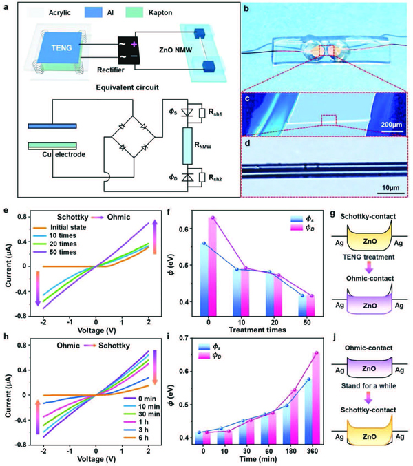 近日,在中科院北京纳米能源与系统研究所王中林院士与李舟研究员团队,以及电子HTH官网地址 大学张岩教授(共同通讯作者)带领下,通过使用摩擦纳米发电机(TENG)产生的高压电脉冲调节肖特基势垒高度,实现了单个器件在肖特基接触状态与欧姆状态之间的可逆转变,使同一生物传感器实现了对神经递质和神经电脉冲的高灵敏度检测。实验结果表明TENG高压电脉冲作用于氧化锌(ZnO)纳米线器件的时候,ZnO纳米线传感器的肖特基势垒会降低,TENG处理达到一定次数,ZnO纳米线传感器可由肖特基接触器件转变为欧姆接触器件。当停止TENG对ZnO纳米线传感器的作用后,降低的肖特基势垒会随着时间的增加而逐渐恢复,欧姆接触器件可恢复为肖特基接触器件。这一可逆转变的机制可能是:TENG产生的高电压脉冲产生使ZnO内部的氧空位发生扩散,在金属半导体接触界面产生极化,使得肖特基势垒降低;当TENG停止作用后,氧空位向反方向扩散,肖特基势垒恢复。在本工作中,通过调节肖特基势垒高度,SOR生物传感器可以在肖特基接触状态与欧姆接触状态发挥不同的检测优势。作者使用同一个SOR生物传感器在肖特基接触状态实现了对低浓度多巴胺分子的检测(0.5µmol/mL)。转变为欧姆接触状态之后,SOR生物传感器对神经电脉冲的灵敏度提高了16倍。该工作提出了一种简单有效且不易损坏纳米器件的肖特基势垒调控方法,该方法拓宽了基于肖特基势垒的传感器应用范围,也为同一器件实现多功能化的高灵敏检测提供了新的技术方案。相关成果以 “Reversible Conversion between Schottky and Ohmic Contacts for Highly Sensitive, Multifunctional Biosensors” 为题发表在了最新一期Adv. Funct. Mater.上。