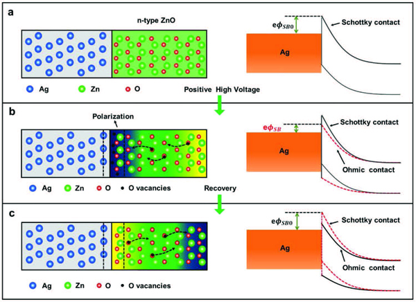 b)TENG产生的高压脉冲驱动氧空位在接触界面处累积,使得肖特基接触转变为欧姆接触。
