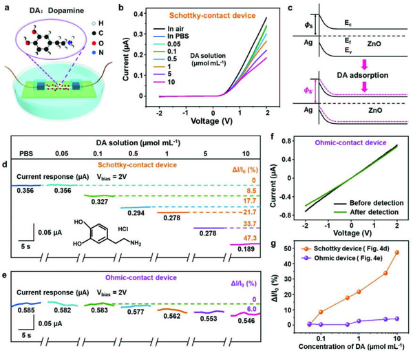 图4 和欧姆接触相比,肖特基接触传感器在检测低浓度多巴胺(DA)分子时灵敏度更高