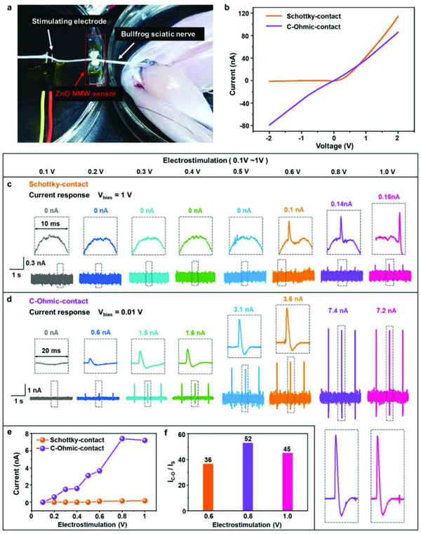 e)不同电压(0.1~1 V)脉冲刺激下,同一SOR器件在肖特基接触(橙色)和欧姆接触(紫色)状态下传感器测得的牛蛙坐骨神经信号的电流响应幅度对比图。