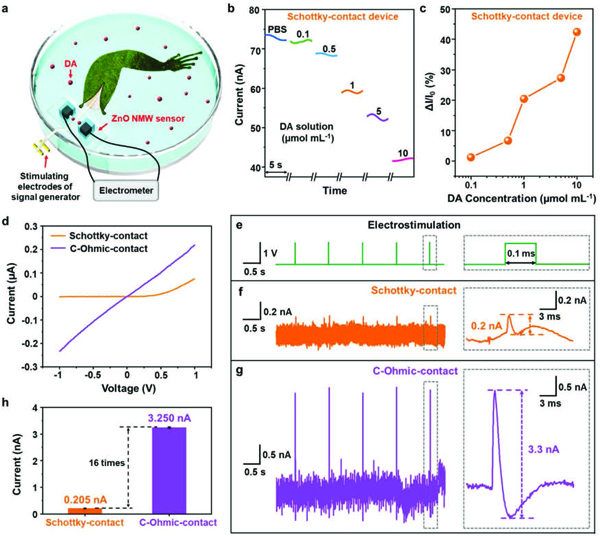 b,c)肖特基接触SOR生物传感器在不同盐酸多巴胺浓度中的I–t曲线图与绝对电流及相对电流响应(ΔI/I0)变化图。