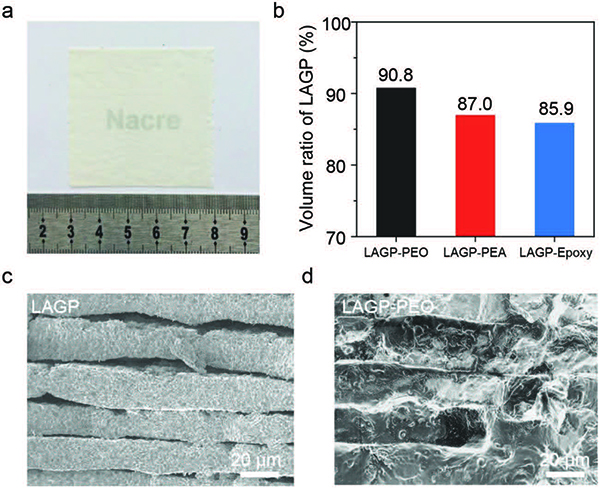 (c,d)PEO渗透和热压之前的LAGP多层片的横截面SEM图像(c)和LAGP-PEO NCPE膜显示了热压之后交错的微观结构(d)。
