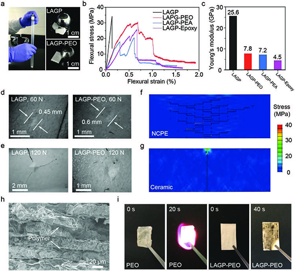 (a)加工后的LAGP–PEO NCPE和纯陶瓷膜的冲击测试,显示出LAGP–PEO NCPE膜具有更高的耐冲击性。
