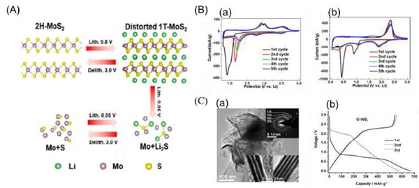 (C)(a)石墨烯状WS2TEM图像;(b)石墨烯状WS2的电化学充放电曲线。