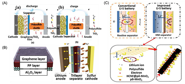 (A)带有(a)石墨烯/TiO2涂膜和(b)常规Li–S电池的电极配置示意图;