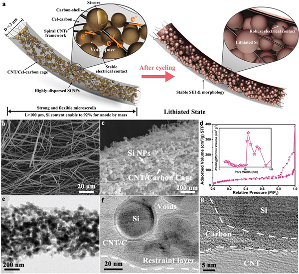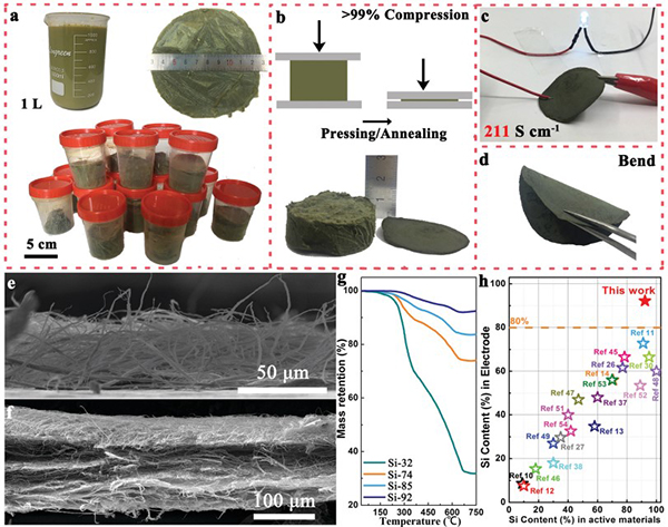 (b-d)通过压制和气凝胶退火(压缩度为499%)获得的自支撑Si@CNT/C微型卷轴电极,并具有(c)出色的柔韧性和(d)良好的导电性(Si含量为85%)。