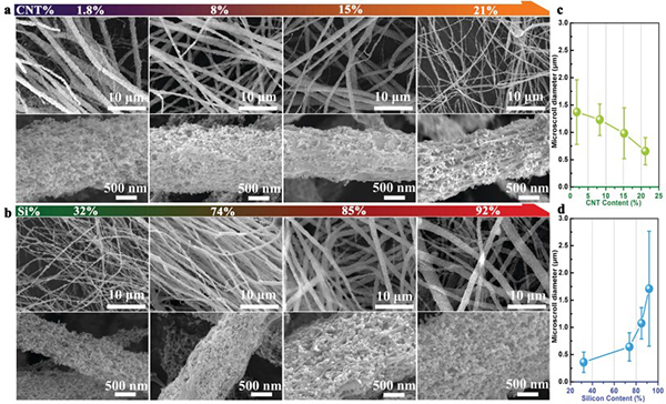 (c,d)具有不同的CNT和硅含量的Si@CNT/C的平均直径和尺寸分布。