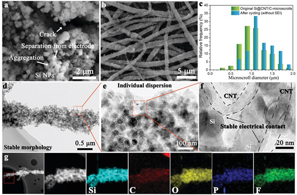 (a,b)不含SEI膜的Si NP电极和Si@CNT/C的微型卷轴电极的SEM图像;