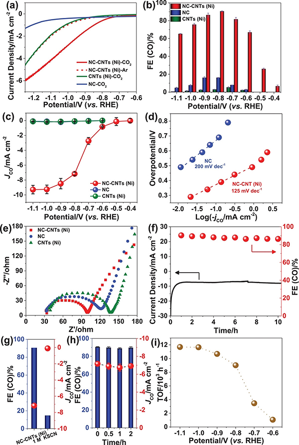 (g)在1 M KSCN中处理10 h之前和之后的NC-CNTs (Ni) 的CO FE和偏电流密度。