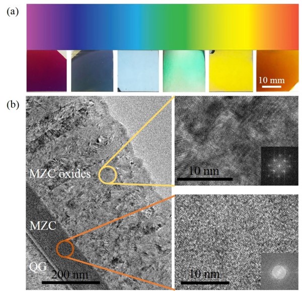 图1,a) 镁基反射型滤光片对应于可见光谱彩色;b) 镁基薄膜截面高分辨透射电镜分析以及对应于吸收层(右上)和反射层(右下)的高分辨投射电镜分析