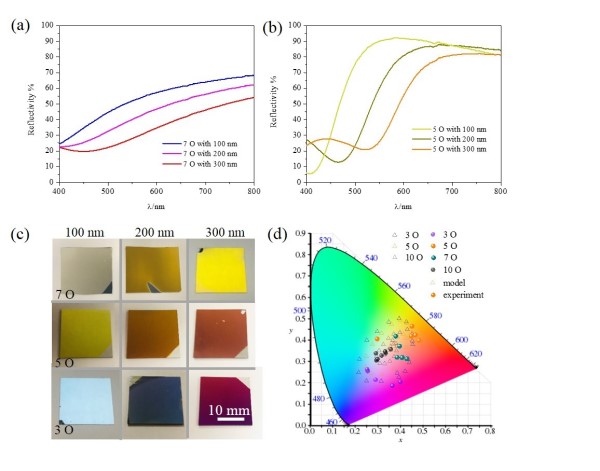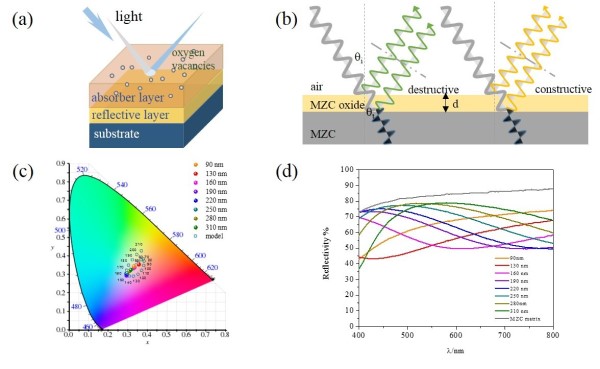 图2,(a) 镁基反射型滤光膜结构(b)薄膜干涉原理示意图,(c)(d) 不同吸收层厚度样品的CIE1931色度图及反射光谱