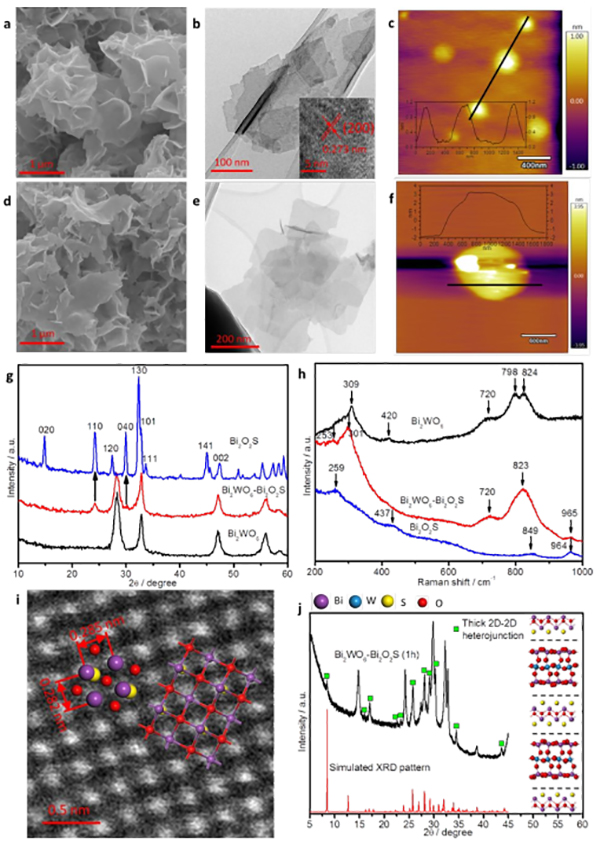 图二、单层Bi2WO6纳米片和Bi2WO6-Bi2O2S 2D-2D异质结纳米片的表征(a-c)单层Bi2WO6纳米片(a)SEM,(b)TEM和(c)AFM图像;