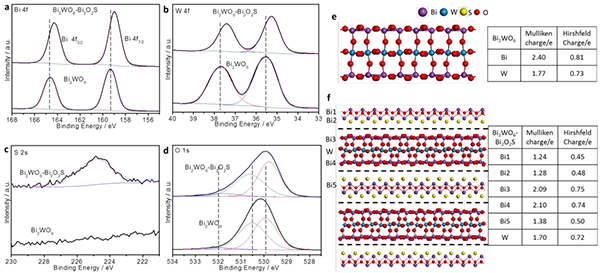 (e,f)晶体结构以及相应的单层Bi2WO6纳米片和Bi2WO6-Bi2O2S 2D-2D异质结纳米片的Mulliken和Hirshfeld电荷。
