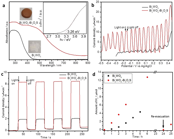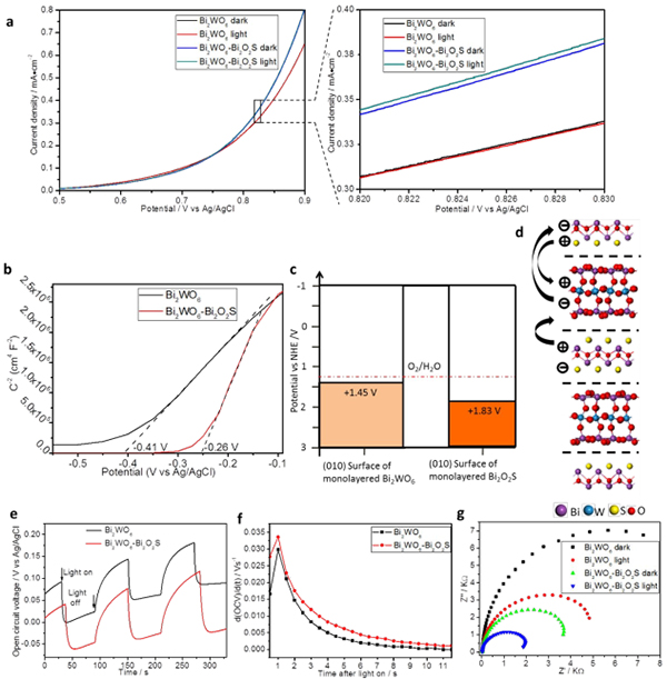 图六、Bi2WO6-Bi2O2S 2D-2D异质结纳米片电荷演示 (a)具有相似吸收系数的Bi2WO6-Bi2O2S 2D-2D异质结纳米片以365 nm LED为光源时的暗电流和光电流密度曲线;