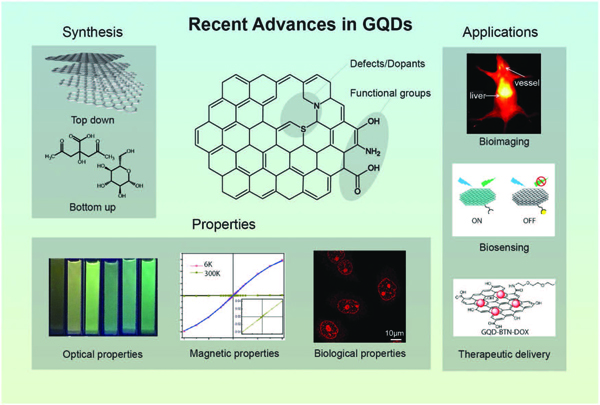 GQD研究的最新进展表明,GQD具有作为生物技术和纳米医学新平台的潜力。通过新的合成方法研究了掺杂和官能化GQDs的方法,并利用其对光学、电子、磁性和生物学特性的影响,将GQDs应用于医学领域。为优化GQDs的理化特性,使其具有特定应用的必要特性,开发了新的实验方法。此外,各种研究都集中在开发安全简单的“一锅法”合成方法上,利用一些简单的前体分子和现成的设备,如家用微波炉。这些成就将GQDs展示为适用于纳米医学的便捷系统。
