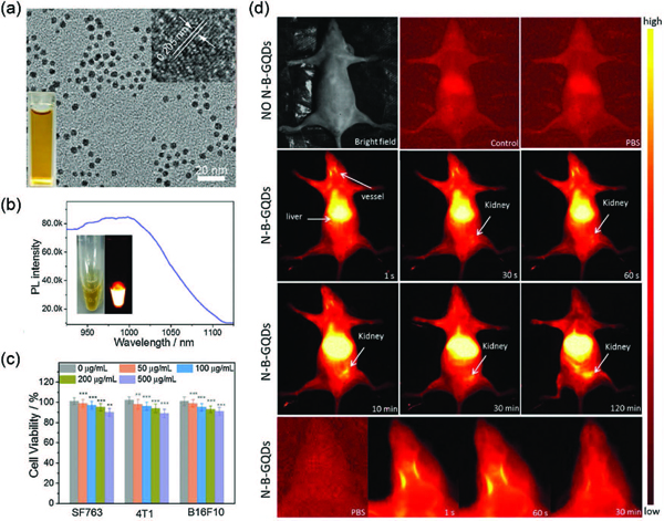 b)当被808 nm激光源激发时,显示NIR-II发射的N-B-GQDs的PL光谱。插图显示水溶液中N-B-GQDs的光学图像和PL图像。