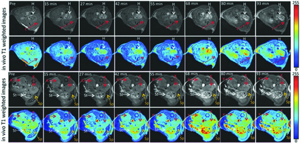 用硼掺杂的GQDs处理小鼠的腹部横断面的体内T1加权MR图像,并在静脉内注射后的各个时间点获得动态的时间分辨MR成像。箭头指示各种器官:心脏(H),肝脏(L),肾脏(K),脾(Sp)和胃(St)。给药后68分钟,心脏和胃部显示出最大的对比度。