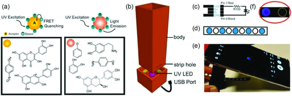 e)使用中的传感器系统的图像。 屏幕显示通过相机检测到的荧光点读取的样品。