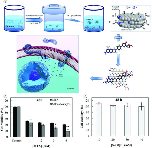 a)通过水热法合成N-GQD,形成MTX- (N-GQD)复合物以及胞内释放的示意图。