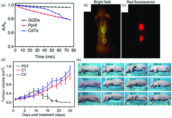 d)三组肿瘤随时间变化的体积(每组n=5)。每组P <0.05。PDT:GQD+辐照,C1:仅GQD,C2:仅光辐照)。
