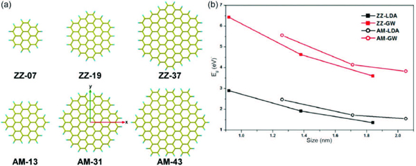 a)不同尺寸和边缘构型的GQDs的结构。标签“AM”和“ZZ”指的是边缘类型,整数表示芳环的数量。