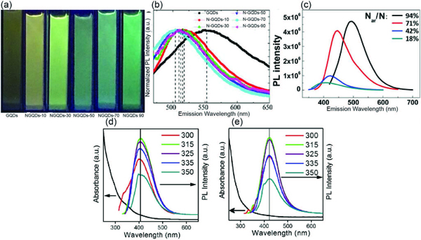 c)芳香胺官能化的GQDs的PL光谱。Nar/N表示芳香胺类与总胺类的比例。随着芳香胺官能化的增加,光谱中出现了明显的红移。