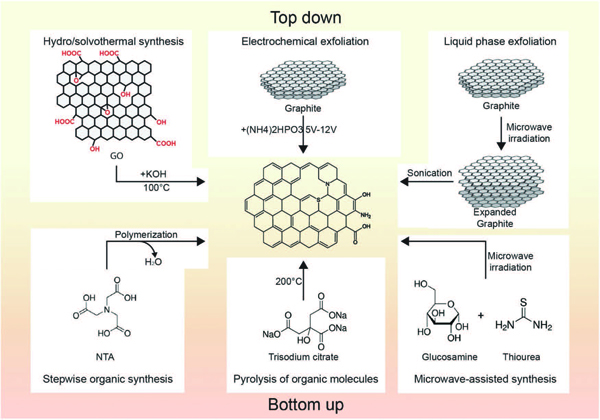 图6 通过自上而下和自下而上的方法合成GQD的最新进展示意图