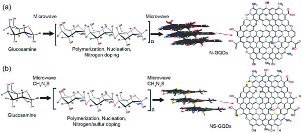 a)N-GQD和b) NS-GQD的微波合成示意图,显示了GQDs与胺基和硫基官能团的官能化。