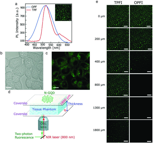 e)TPFI和单光子荧光成像(OPFI)在组织体模中的N-GQDs渗透深度(比例尺= 100 µm)。