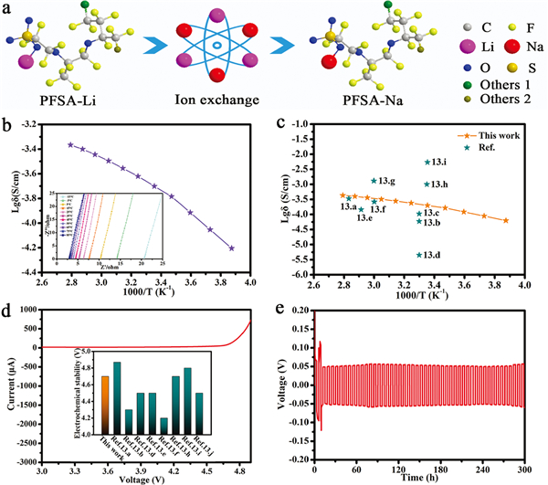 本文通过一种简便的离子交换与溶液刮涂法制备了聚合物固态电解质(PFSA-Na膜),具有很高工业生产价值。这种PFSA-Na膜在很宽温度范围内具有高离子电导率、热稳定性和低温性能。基于PFSA-Na电解质和HQ-NaFe正极的SSIBs表现出优异的循环稳定性,高的倍率性以及室温下约100%的高库仑效率。最重要的是,基于PFSA-Na膜的SSIBs,在-35°C下仍具有稳定的循环表现。本文中所提供的PFSA-Na膜是一种极具前景的钠离子电池固态电解质,且本文所组装的SSIBs为大规模储能系统提供了新选择。文章第一作者为杜光远、陶梦丽,通讯作者为戚钰若、包淑娟和徐茂文。