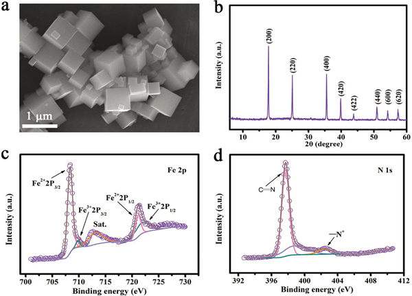 (c,d)HQ-NaFe的XPS谱图:(c)Fe 2p;(d)N 1s。