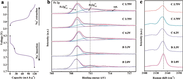 (b)不同充放电状态下,HQ-NaFe的非原位XPS谱图;