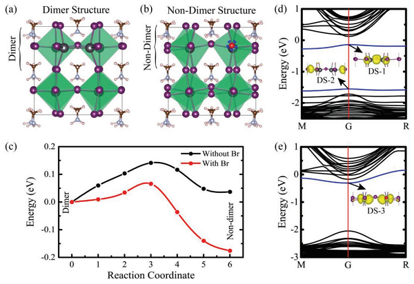 (c)MAPbI3和MAPb(I0.96Br0.04)3的二聚体和非二聚体结构转变能垒;
