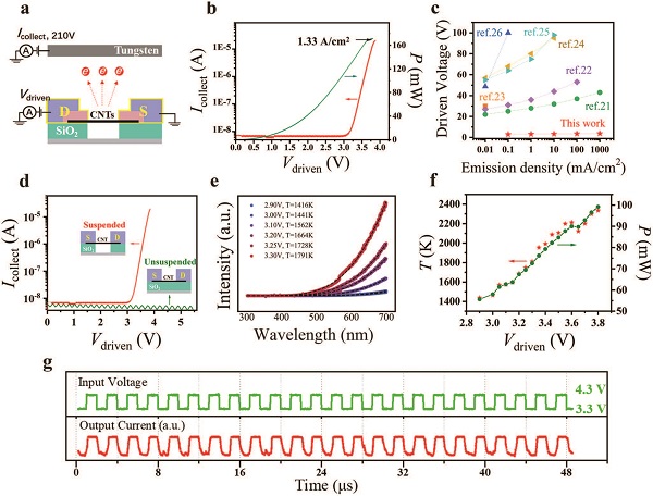 碳纳米管(CNT)具有优异的导电性、导热性、机械和热稳定性,是一种稳定可靠的微型热电子灯丝。 魏贤龙课题组前期的工作研究已经证实碳纳米管具有优异的热电子发射性能以及利用碳纳米管在片上集成微型热电子发射阵列的可行性。