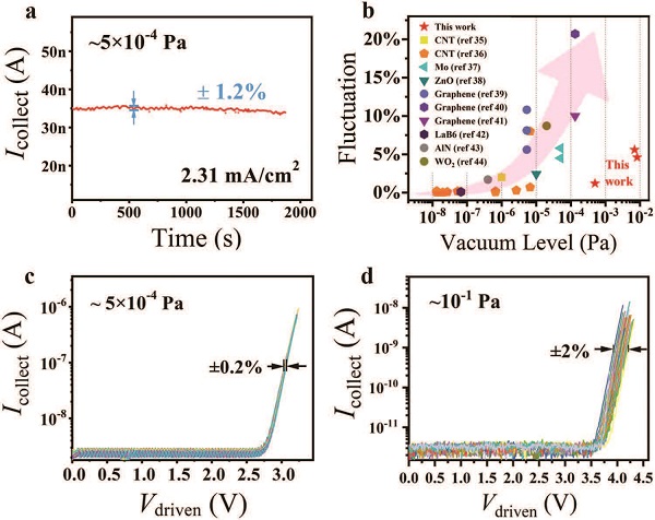 (b)本文的微型电子发射源的真空度和发射电流波动与先前报道的FEAs 的比较;