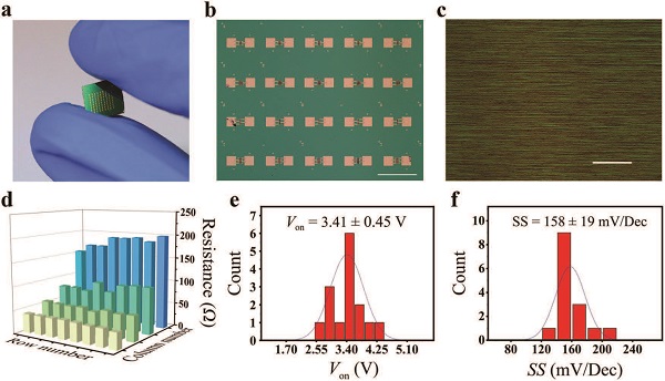 (f)15个器件亚阈值斜率(SS)的统计分布。