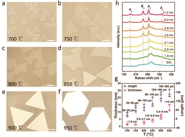 他们以混合的NaCl和金属Cr粉末作为金属前驱体,通过化学气相沉积(CVD)方法成功合成了厚度可调(1.9 nm至数十纳米)的菱方Cr2S3纳米片。该合成过程的关键因素可归纳如下:i)使用混合的NaCl和Cr粉末作为金属前驱体可确保适度的Cr前驱体供应;ii)具有原子级平整和惰性表面的云母基底有利于范德华外延生长超薄Cr2S3纳米片;iii)通过对生长温度的精确调控,实现了对成核密度、畴区尺寸和厚度的精确控制。特别是,通过对不同厚度Cr2S3纳米片电学性质的研究,揭示了Cr2S3纳米片层厚依赖的导电类型转变。即随Cr2S3纳米片厚度的增加,导电类型从p型过渡到双极性,再过渡到n型。该研究对二维磁性材料的层厚控制合成,其磁性能的研究以及其在电子器件领域的应用具有重要意义。
