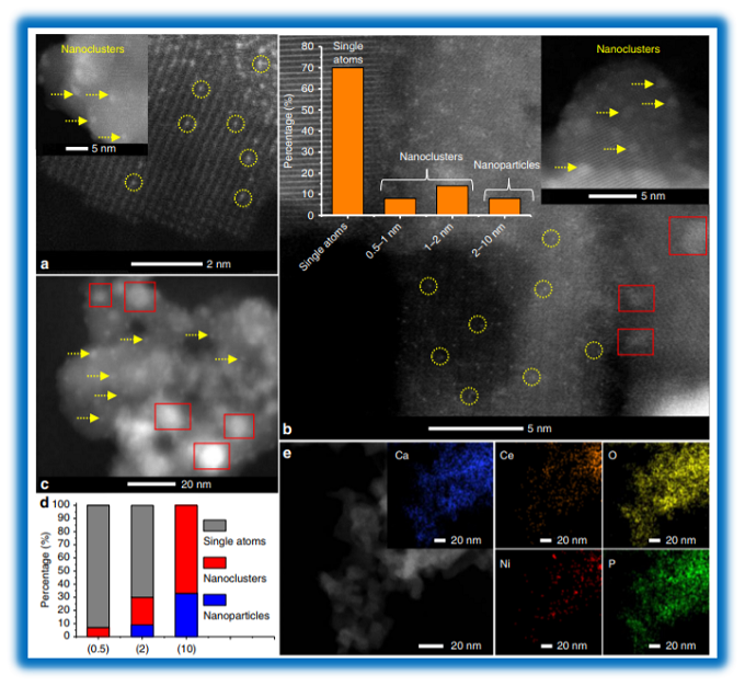 CO2和CH4是两种最主要的大气温室气体(GHGs),但它们也是丰富且低成本的碳源;CH4被认为是(相对)清洁能源,可用来实现低碳经济。甲烷干重整(DRM)是将甲烷(CH4)和二氧化碳(CO2)转化为合成气(H2+CO)的过程,这是世界级的大规模工业过程和能源转化(例如费托合成(FT),羰基化,加氢甲酰化)以及用于燃料和高附加值化学品的合成的重要组成部分。经过近30年的深入研究,Ni催化剂因其低成本和高初始活性(与贵金属催化剂相比)而成为最有前途的DRM候选物。然而,由于碳沉积(焦化)和/或烧结的Ni物种使催化剂失活问题,迄今尚无商业DRM工艺。近日,中科院大连化物所张涛,乔波涛等报道了一种通过与Ce掺杂的羟基磷灰石(HAP)相互作用而稳定原子分散的Ni单原子催化剂,该催化剂中CeOx掺杂的HAP稳定了孤立的Ni原子,防止催化剂的烧结和失活,可高活性和高稳定性的催化DRM。实验和计算研究表明,孤立的Ni原子具有固有的耐焦炭性,因为它们具有独特的仅激活CH4中第一个C-H键的能力,从而避免甲烷深度分解成碳。该工作为大规模开发地球富含的DRM催化剂提供了新的机会。