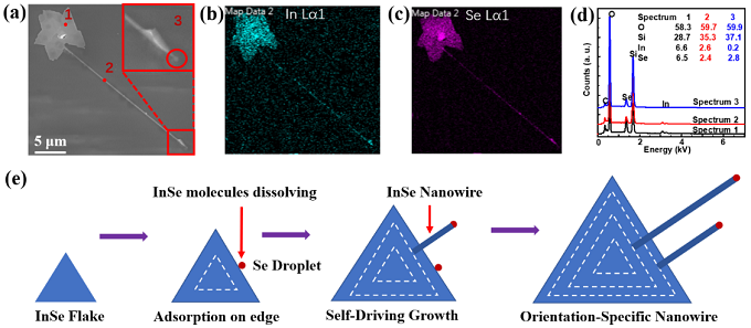 (a-d) 纳米片与纳米线的扫描电镜图、EDS图以及对应的能谱图。 (e) 边界同质外延生长纳米线阵列的机理示意图。
