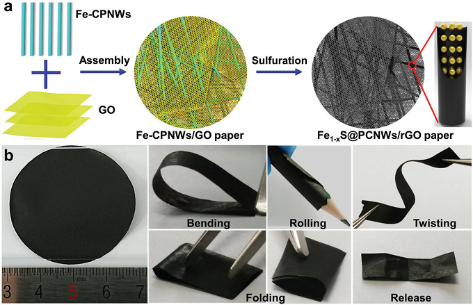 图2. Fe1-xS@PCNWs/rGO混合纸的构造示意图,以及其外观和柔韧性(弯曲,卷起,扭曲和折叠)的图像。